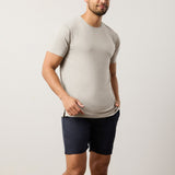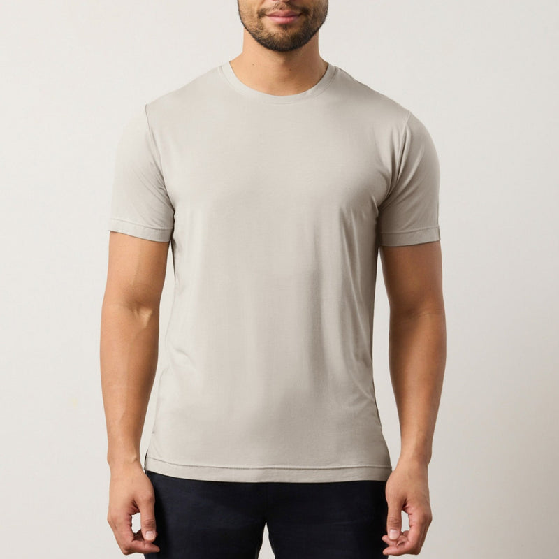 Your gym shirt and your dress undershirt are now the same thing. Premium opacity means it works as a standalone tee; the lightweight profile ensures it vanishes under layers. Available in V-Neck for open collars or Crew for a classic look.